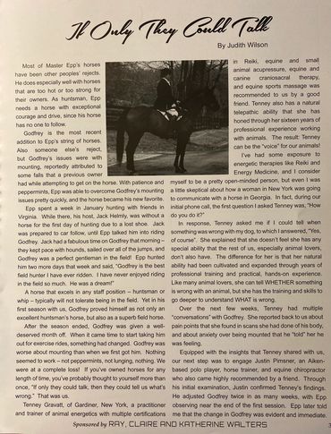 "Tenney is the real deal. When she read one of my horses, he said I was obsessed with his tail. I started laughing. He is a beautiful gray whose tail gets very dirty. When we are going out in public, I frequently have to wash his tail 3-5 times to get it clean! She was able to communicate some helpful hints for both of us that have made our relationship even better. My retired horse got a vacation from his therapeutic riding job due to Tenney's talk with him. He reverted back to his 4 year old self as he was so happy. Thanks Tenney!"
