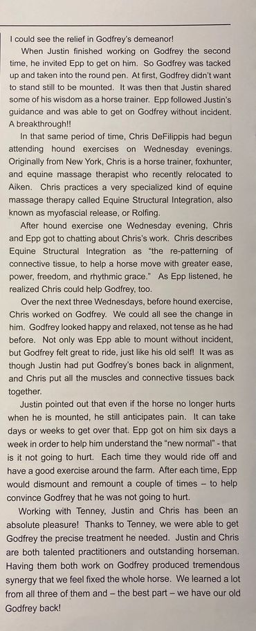 "Tenney has been a tremendous help with my aging gelding, Joe. He came to us from a rescue situation, and we had heard several stories about his history. Tenney was able to connect with him, learn some of his wants and needs, and allow us to begin focusing on what is best for him. We greatly appreciate having such an insightful partner in our horse's life!"